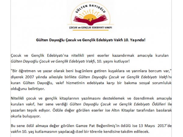 GÜLTEN DAYIOĞLU ÇOCUK VE GENÇLİK EDEBİYATI VAKFI, 2007 yılından beri nitelikli çocuk ve gençlik edeb...
