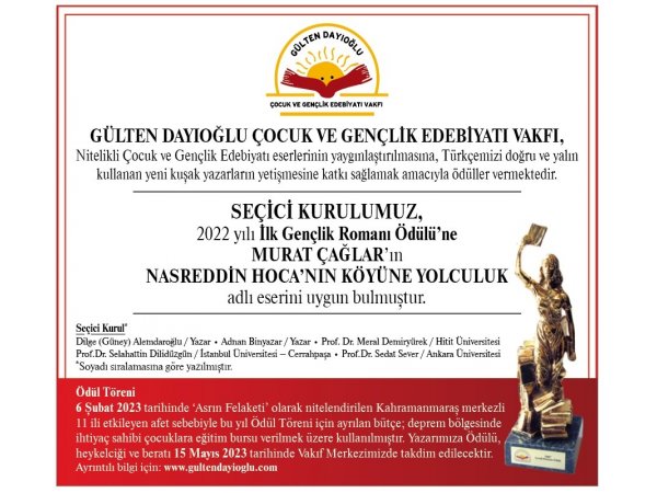 Gülten Dayıoğlu Çocuk ve Genclik Edebiyatı Vakfı'nın 2022 Yılı İlk Gençlik Romanı Ödülü "Nasreddin H...